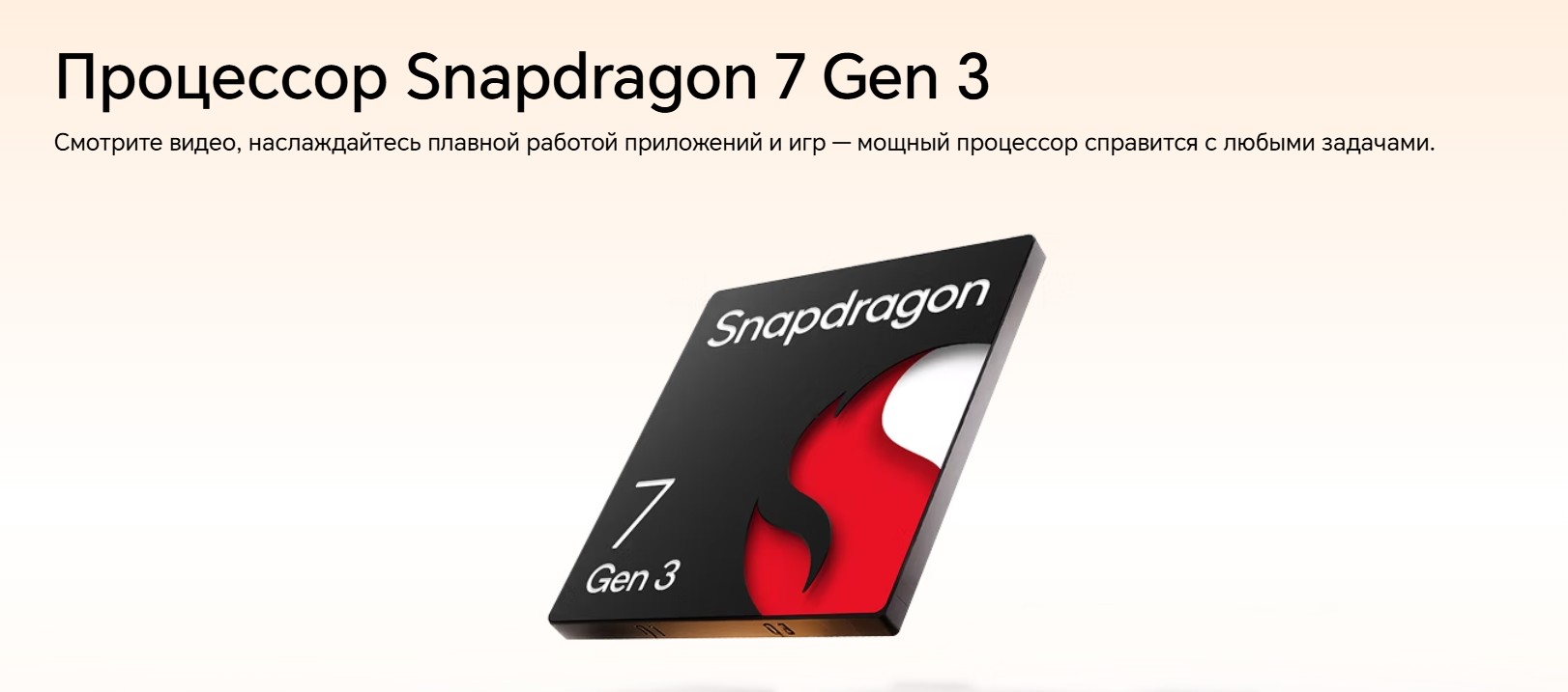 За производительность отвечает Snapdragon 7 Gen 3. Это процессор среднего уровня, выполненный по 4-нм техпроцессу. В бенчмарках он не стремится конкурировать с флагманами, но в реальной работе смартфон быстрый и отзывчивый.