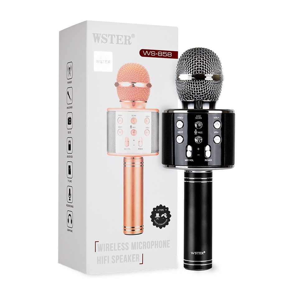 Оригинальное устройство, объединившее в себе вокальный Bluetooth-микрофон и универсальную стерео колонку. Мобильный караоке-микрофон WSTER WS-858 может стать отличным инструментом для начинающих вокалистов или средством скрасить приятный вечер в компании друзей.
