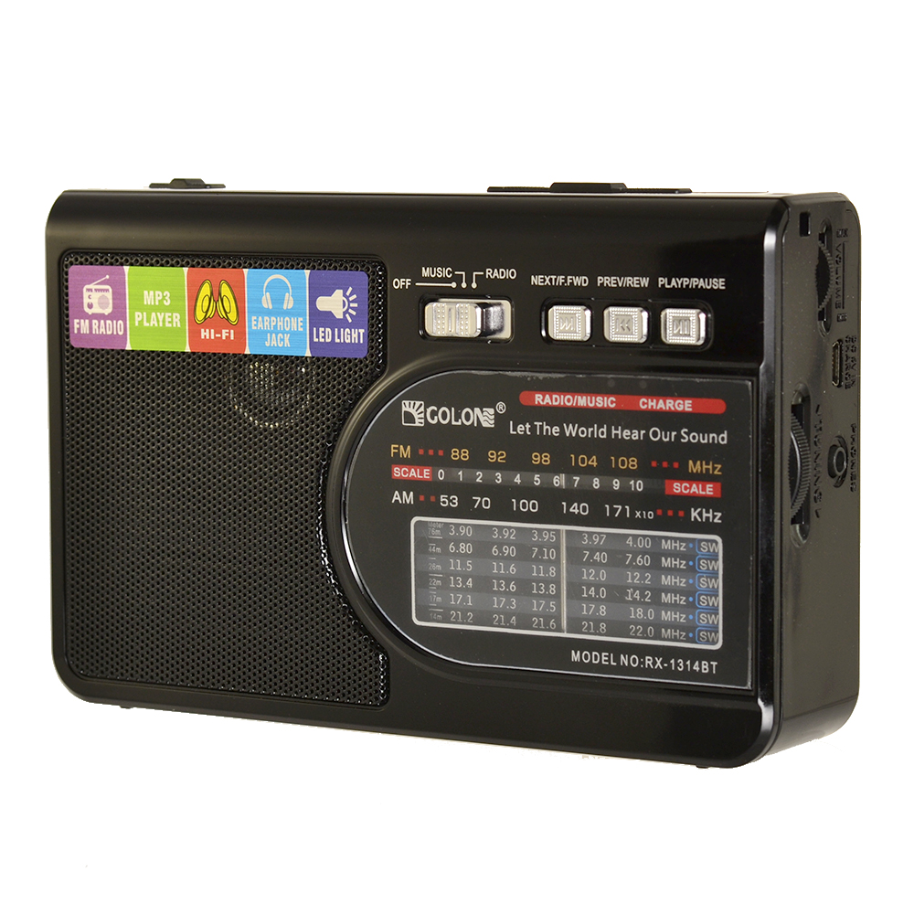 Компактный радиоприемник GOLON RX-1314BT в классическом черном корпусе представляет собой удобное в управлении и надежное аудиоустройство. Эта модель работает в FM-диапазоне в частотном интервале от 88 МГц до 108 МГц, а также принимает станции AM-диапазона, вещающие на частотах от 520 кГц до 1610 кГц. Качественный монозвук обеспечивает динамик с мощностью 1 Вт, находящийся на лицевой панели радиоприемника GOLON RX-1314BT.