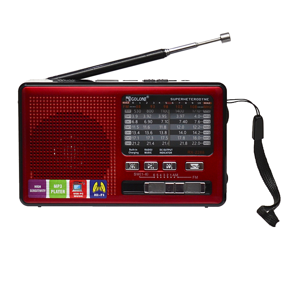 Радиоприемник Golon RX-2288 - это современный, небольшой, но чрезвычайно функциональный прибор, который поможет Вам приукрасить Ваш досуг. На верхней стороне корпуса расположено множество выходов-входов для подключения к приемнику дополнительных устройств. Среди них и USB выход, и выход кардридера и разъем mini jack для подключения наушников с размером штекера 3.5мм. Также этот портативный радиоприемник оснащен довольно ярким фонарем