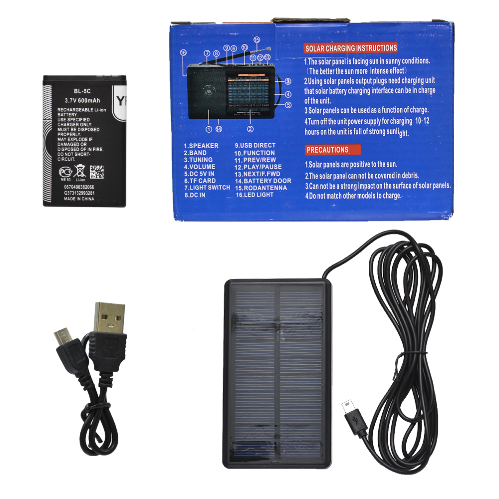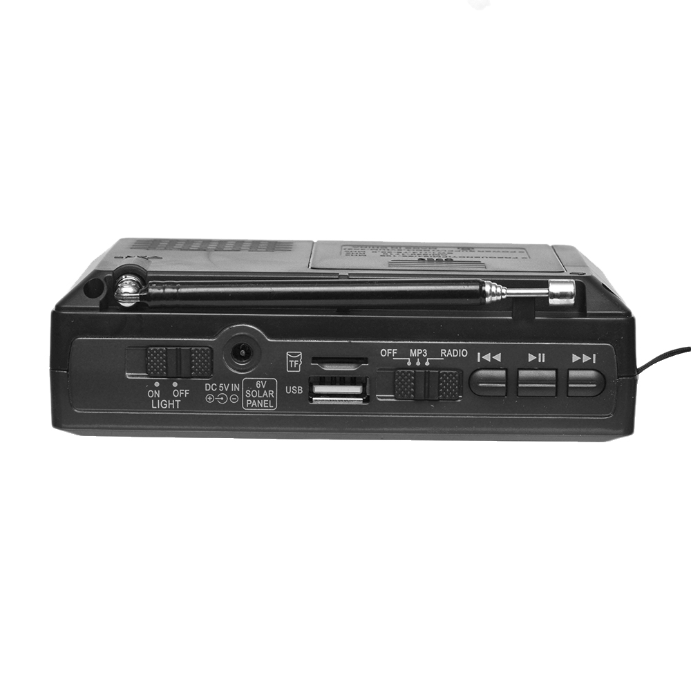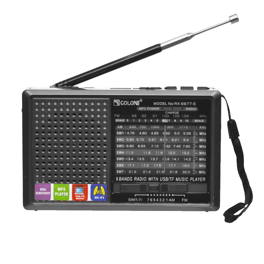 Радиоприемник Golon RX-BT6677-S - это портативное устройство, которое можно взять с собой в дорогу, на дачу или просто слушать дома. Устройство работает от батареек и от солнечной батареи, Воспроизводит аудиофайлы в формате MP3. Компактный и достаточно функциональный, на корпусе расположена ручка для переноса и телескопическая антенна. Приемник принимает 5 волн: AM, FM, SW1 - 7 Поддержка радио: FM диапазон: 64 - 108 МГц, TV диапазон: 2 - 5 канал, AM диапазон: 530 - 1600 КГц, SW диапазон: 7.5 - 190 МГц Поддержка носителей памяти: USB накопители,micro SD карты памяти